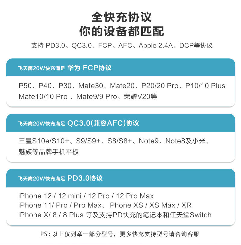 飛天鷹20W氮化鎵充電器支持蘋果、華為、小米、三星、OPPO、VIVO等各品牌手機(jī)和平板