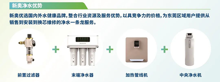 東莞新奧聯手凈水知名品牌飛利浦共同打造水健康惠民產品。根據家庭需要搭配前置過濾器、溫式壁掛機、RO反滲透凈水器等凈水設備,還可定制全屋凈水健康解決方案,為用戶提供全方位的健康飲用水體驗。