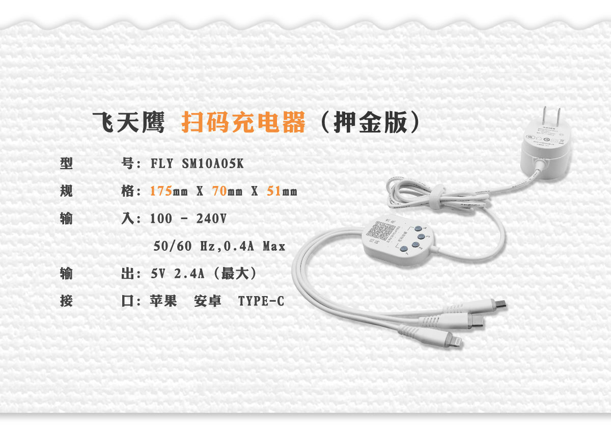共享充電線,支持手機掃碼使用的充電器,由深圳市飛天鷹科技研發(fā)和生產(chǎn)制作,飛天鷹共享充電線主要適用于室內(nèi)場所,如酒店,網(wǎng)咖,休閑中心,KTV等,共享充電線價格便宜,回本周期很快。是共享經(jīng)濟體的入門級產(chǎn)品,也是明星產(chǎn)品。