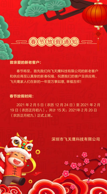 2021年2月5日(農(nóng)歷12月24日)至2021年2月19日(農(nóng)歷正月初八),共計(jì)15天;2021年2月20日(農(nóng)歷正月初九)正式上班。