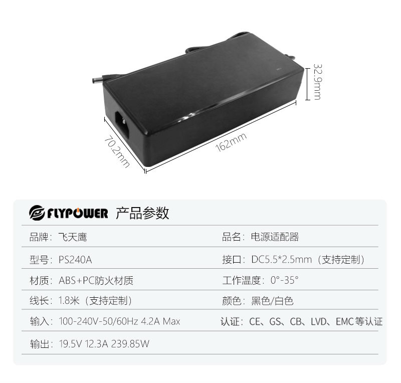 輸 出:30V8A 24V10A 20V9A 20V11.5A 19.5V12.3A 26V9.23A 240W max